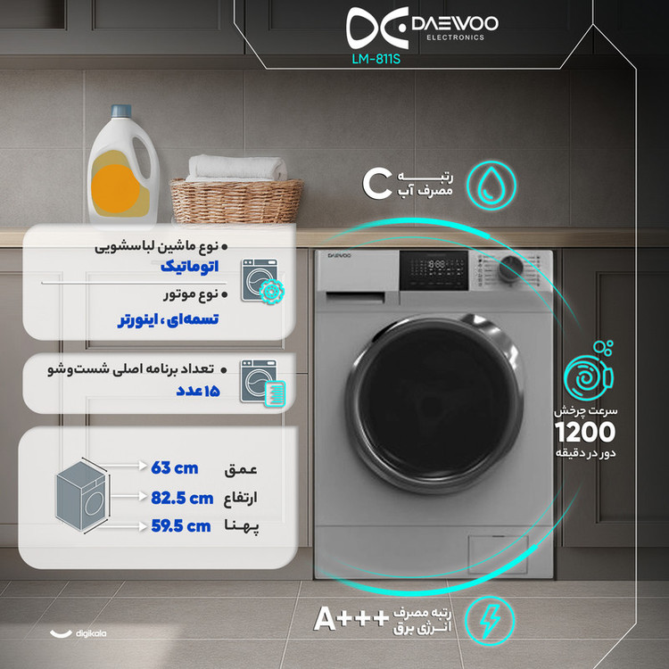 قابلیت شروع با تأخیر (Delay Start) انعطافپذیری بالایی در مدیریت زمان به کاربر میدهد. در حالی که رتبه انرژی دستگاه کاملاً بهینه است، رده مصرف آب C در این مدل نشان میدهد که دوو تمرکز اصلی خود را بر بهینهسازی مصرف برق قرار داده است. با ابعاد استاندارد (پهنا ۵۹.۵ و عمق ۶۳ سانتیمتر)، این ماشین بهراحتی در فضای استاندارد آشپزخانهها جای میگیرد. موتور اینورتر، سرعت بالای خشککن و بخارشوی، LM-811S را به انتخابی قدرتمند در میان مدلهای ۸ کیلوگرمی با ظرفیت بالا و عملکرد هوشمند تبدیل کرده است.