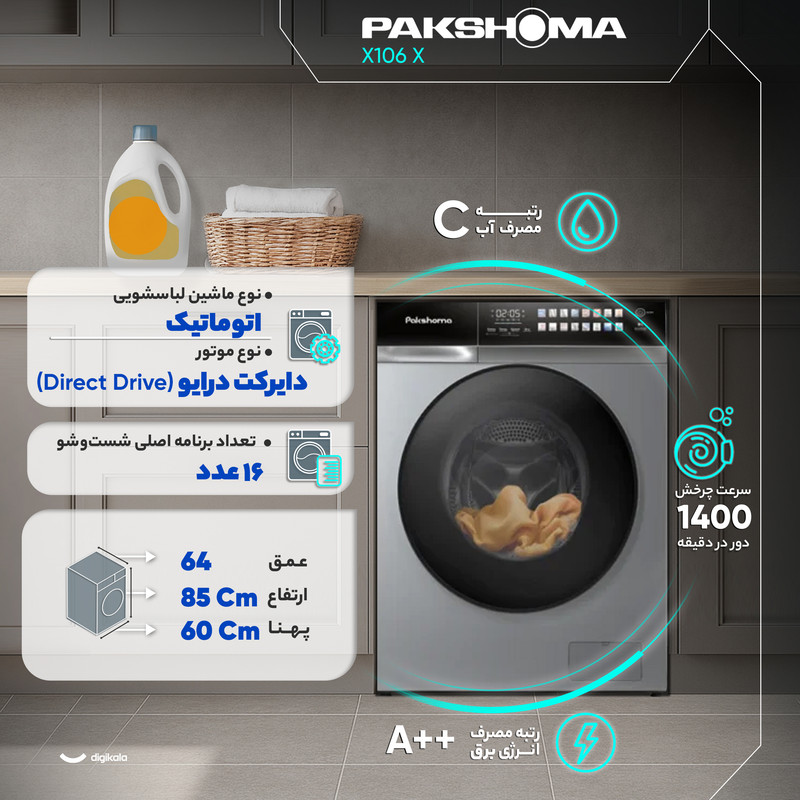 در بخش طراحی، ماشین لباسشویی 11 کیلوگرم اتوماتیک پاکشوما مدل X106 X با بدنه آلومینیومی مقاوم، درب از جلو با باز شدن به سمت چپ و طراحی دیگ استیل ضدزنگ الماسه ساخته شده است. این ساختار از آسیب دیدن الیاف جلوگیری میکند و کیفیت شستوشو را افزایش میدهد. کنترل ترکیبی لمسی و چرخشی استفاده از دستگاه را سادهتر میکند و ابعاد ۸۵ × ۶۰ × ۶۴ سانتیمتری، امکان نصب آسان دستگاه را در فضاهای استاندارد فراهم میسازد. این مدل با ظرفیت بالا، موتور قدرتمند و امکانات حرفهای، انتخابی مناسب برای خانوادههایی است که به شستوشوی حجم زیاد و عملکرد مطمئن نیاز دارند.